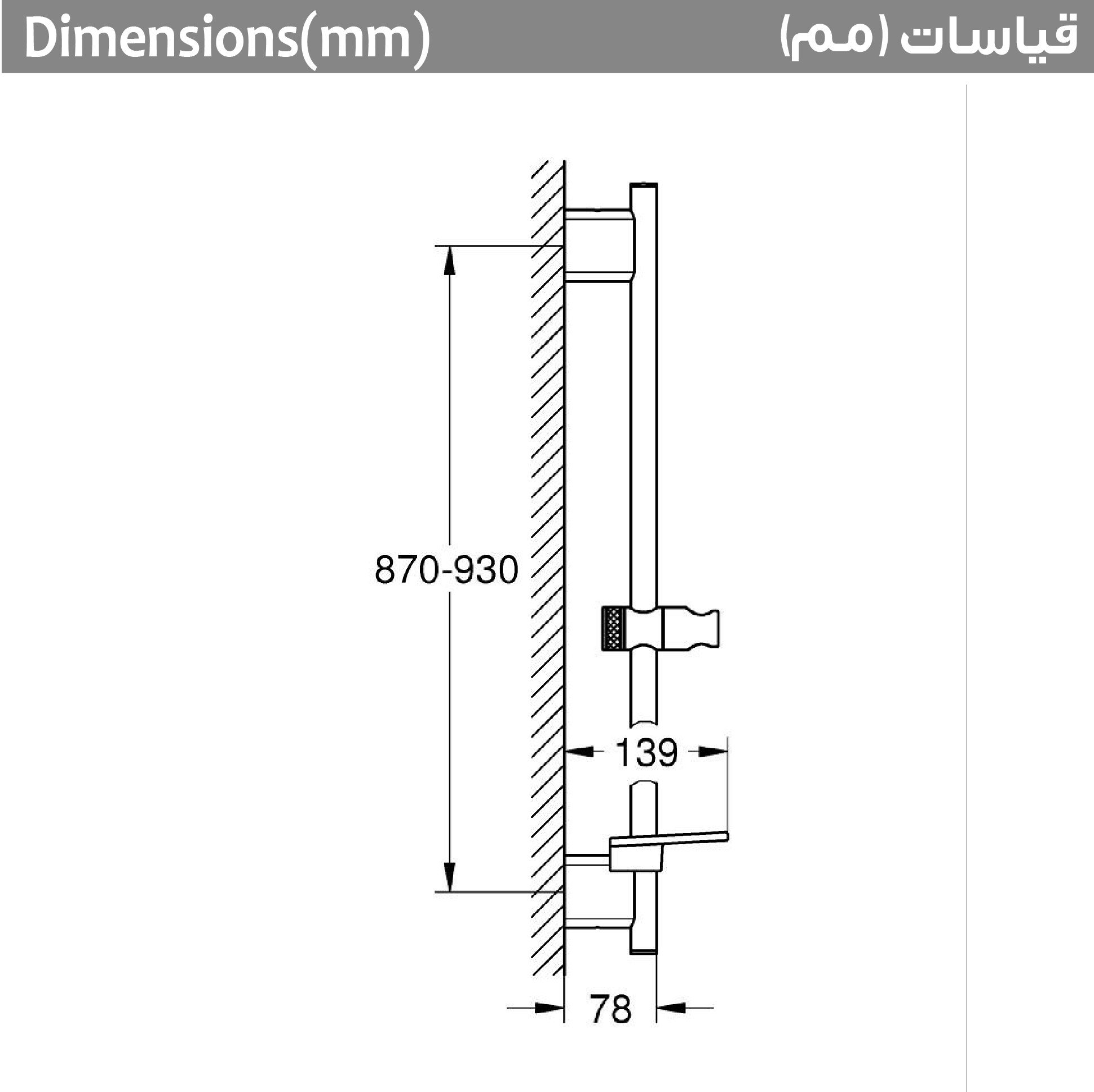 - مسافة قابلة للتعديل بين حامل الدش الجداري للمواءمة مع حفر التثقيب الموجودة